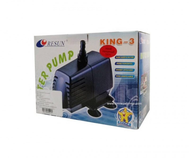 King-3 ปั้มน้ำKing -3 แกนใบพัดเซรามิค ใช้ทนทาน เสียงเงียบ ให้กำลังสม่ำเสมอ ใช้ได้ทั้งนำจืด และน้ำทะเล ของแท้จากบริษัทรีซันประเทศไทย กำลังปั้ม 2400 L/Hr กำลังไฟ 35 w ปั้มน้ำได้สูง 2.4 m